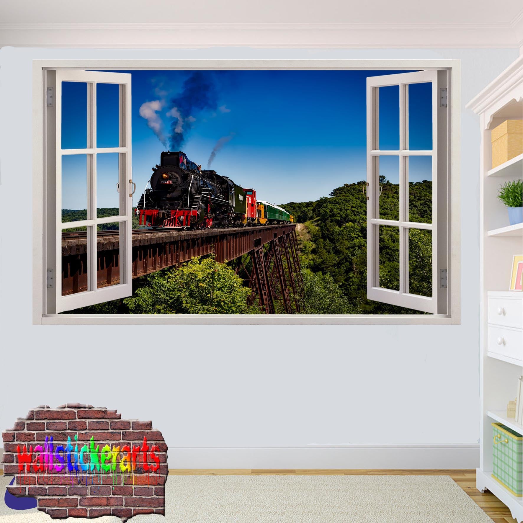 Steam Train Over Metal Bridge 3d Art Smashed Effect Wall Sticker Room Office Nursery Shop Decor Decal Mural YJ6