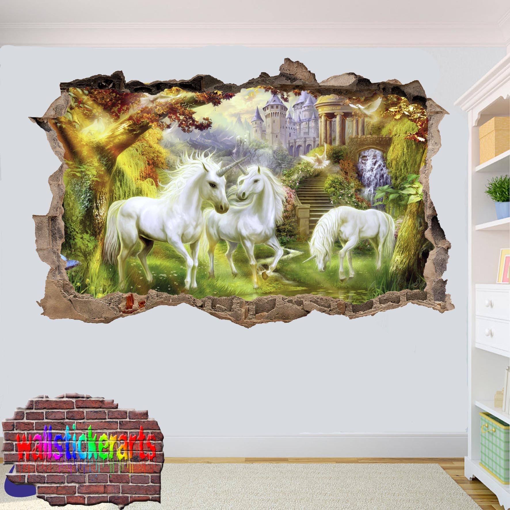 Unicorns in Dreamland Forest 3d Smashed Wall Stickers Room Decoration Decal Murals